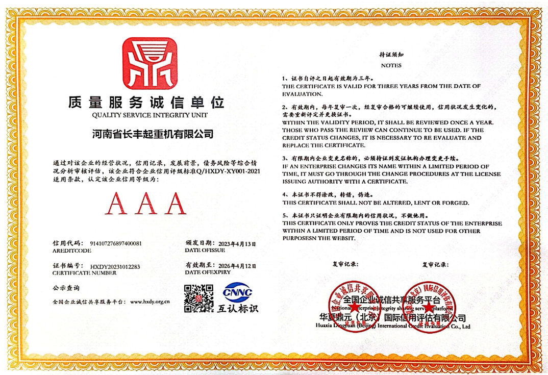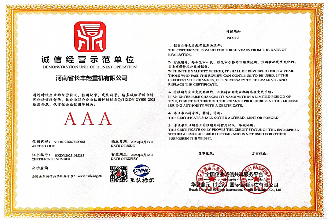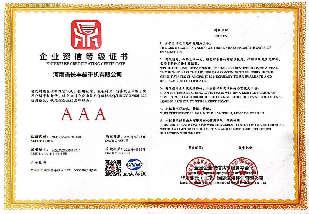 河南省长丰起重机有限公司是生产起重机的实力厂家,主要从事:单梁起重机、双梁起重机、门式起重机、防爆系列起重机的制造与销售。本公司是中国起重行业协会成员单位,具有国家质量监督检验检疫总局颁发的单、双梁起重机、门式起重机、特种设备制造许可证和安装、改造、维修许可证。
